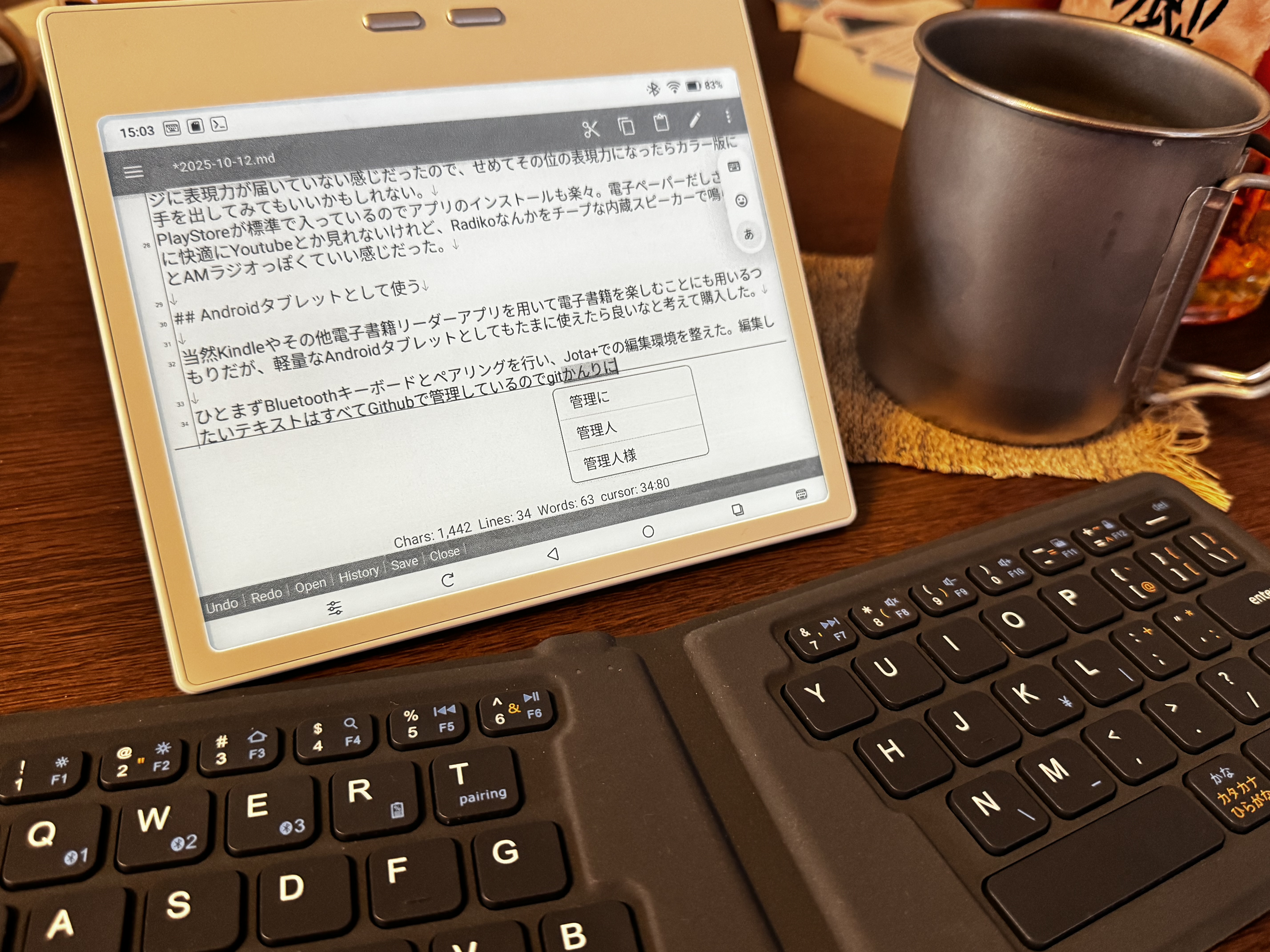ひとまずBluetoothキーボードとペアリングを行い、Jota+での編集環境を整えた。編集したいテキストはすべてGithubで管理しているのでgit管理にはTermuxを入れている。ここの所がもっとシームレスになる環境があったらいいなー、と思うので良い案があったら教えて欲しい。